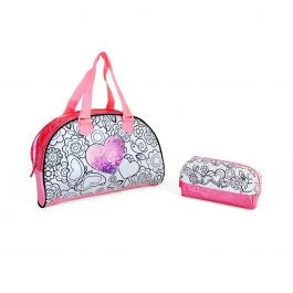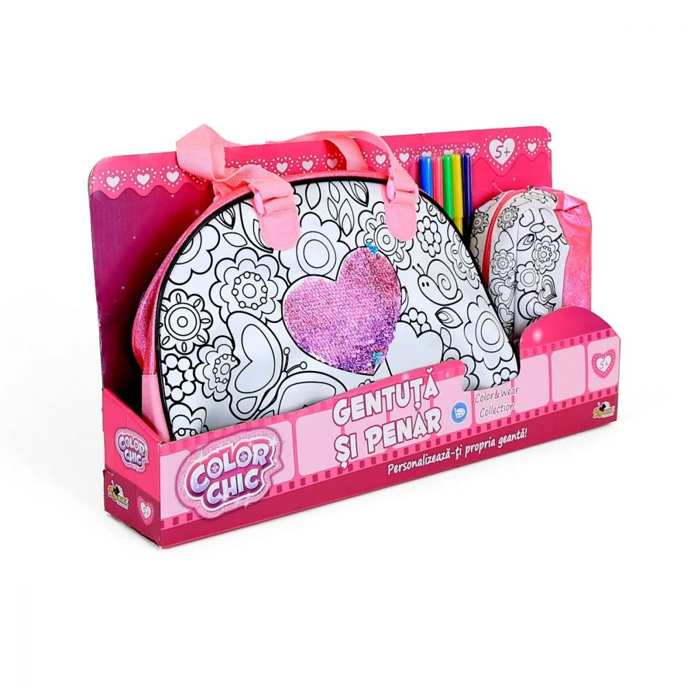 Personalizeaza-ti setul de gentuta si penar asortate colorandu-le cu cele 5 markere incluse si poarta-le in stilul tau unic ca sa dai clasa... scolii.