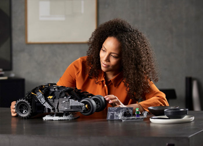 Impresionantul Tumbler de construit si expus din trilogia Dark Knight a filmelor Batman include un acoperis cu deschidere ce ofera acces la scaunele soferului si pasagerilor si la panoul de comanda. Minifigurinele Batman si Joker sunt incluse cu un stativ. Avand o baza robusta pentru a expune modelul finalizat in pozitia cea mai favorabila, reproducerea Tumbler-ului va oferi satisfactii mult timp dupa ce activitatea practica s-a incheiat.