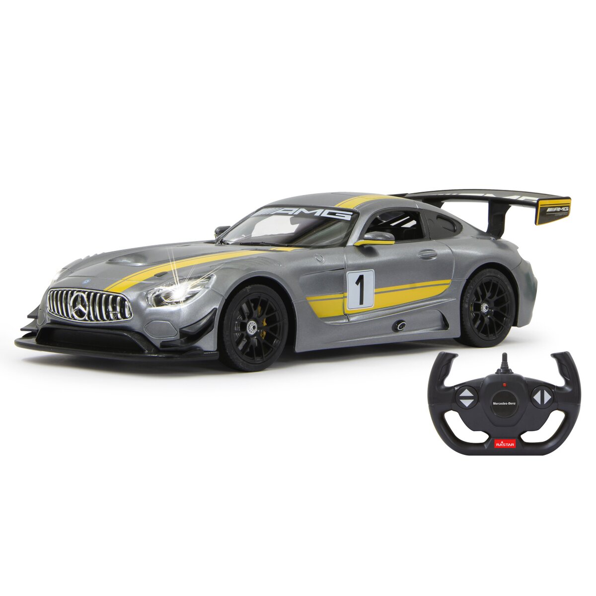 Copilul dumneavoastra se poate juca in voie cu masinuta radiocomandata Mercedes-Benz AMG GT3 de la Rastar. Nici o cursa nu este imposibil de castigat cu aceasta masinuta, replicata scalata a modelului de masina original.