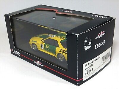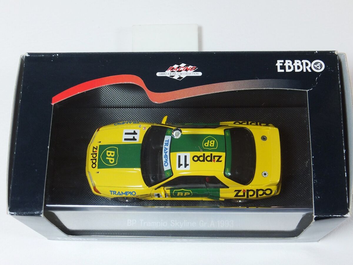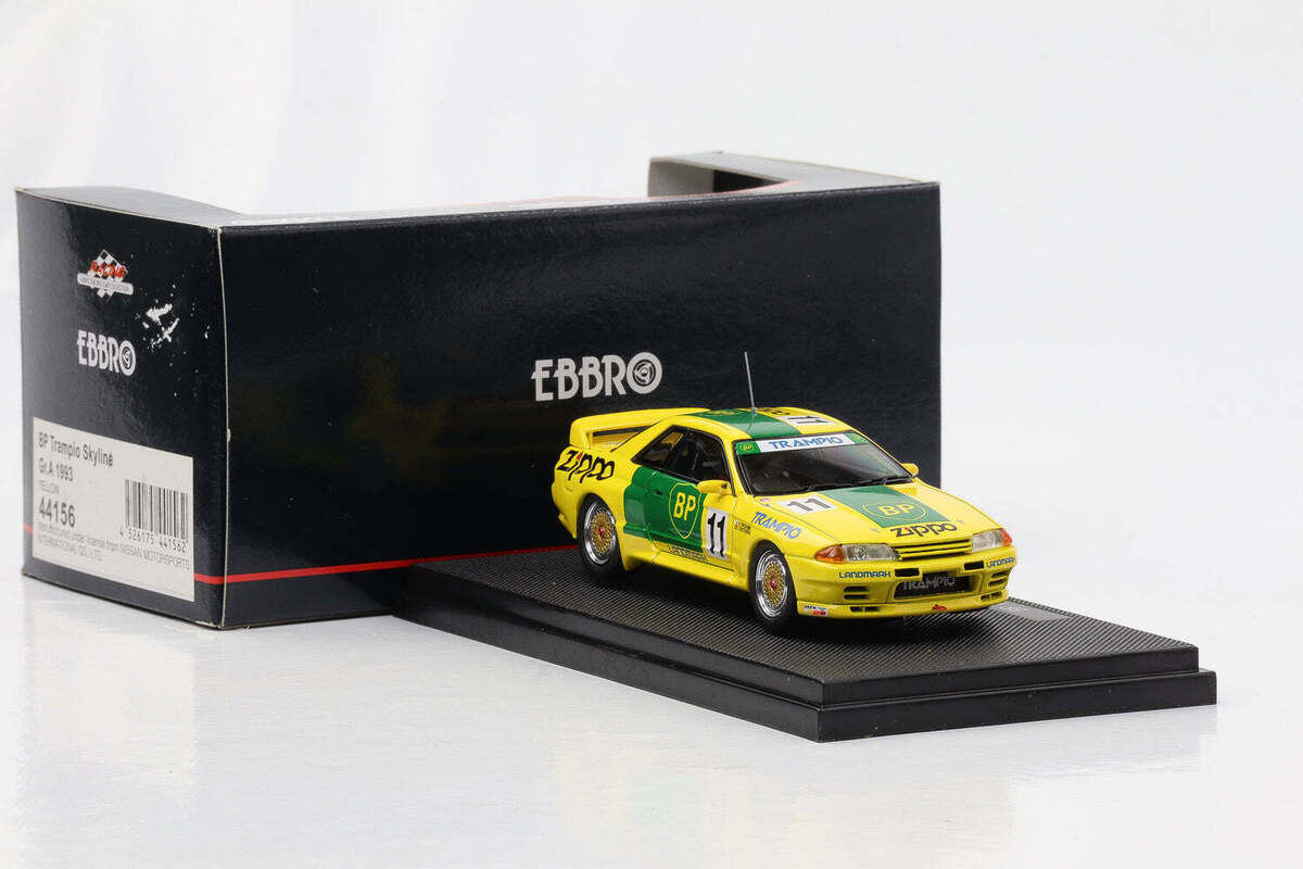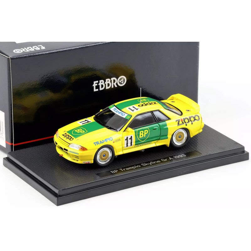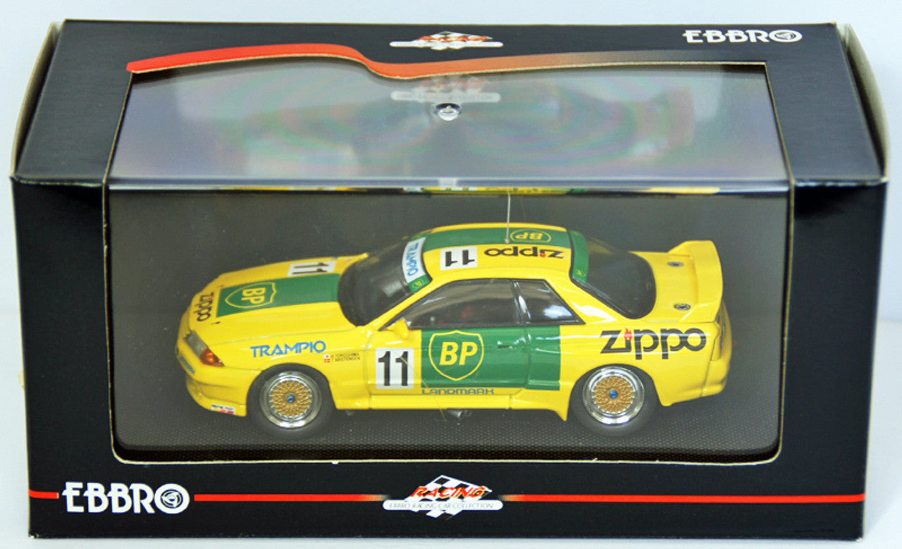 Macheta Nissan BP Trampio Skyline Gr.A 1993 #11 galben/verde cu vitrina plexiglass , produsa la scara 1/43 de Ebbro.
