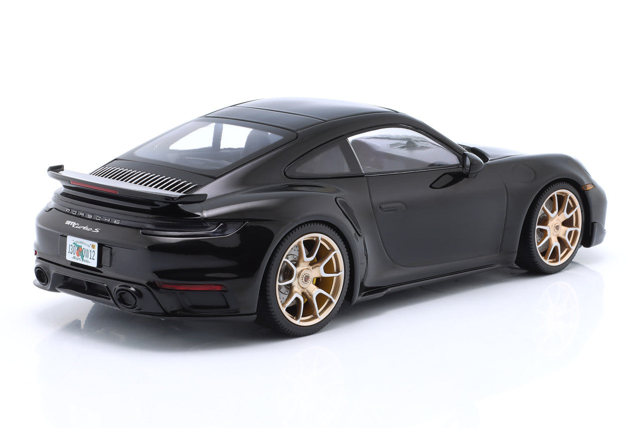 Macheta Porsche 911 (992) Turbo S Coupe Sport Design 2024 negru cu jante aurii 1/555pcs , produsa la scara 1/18 de Minichamps.
