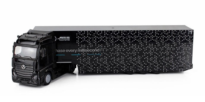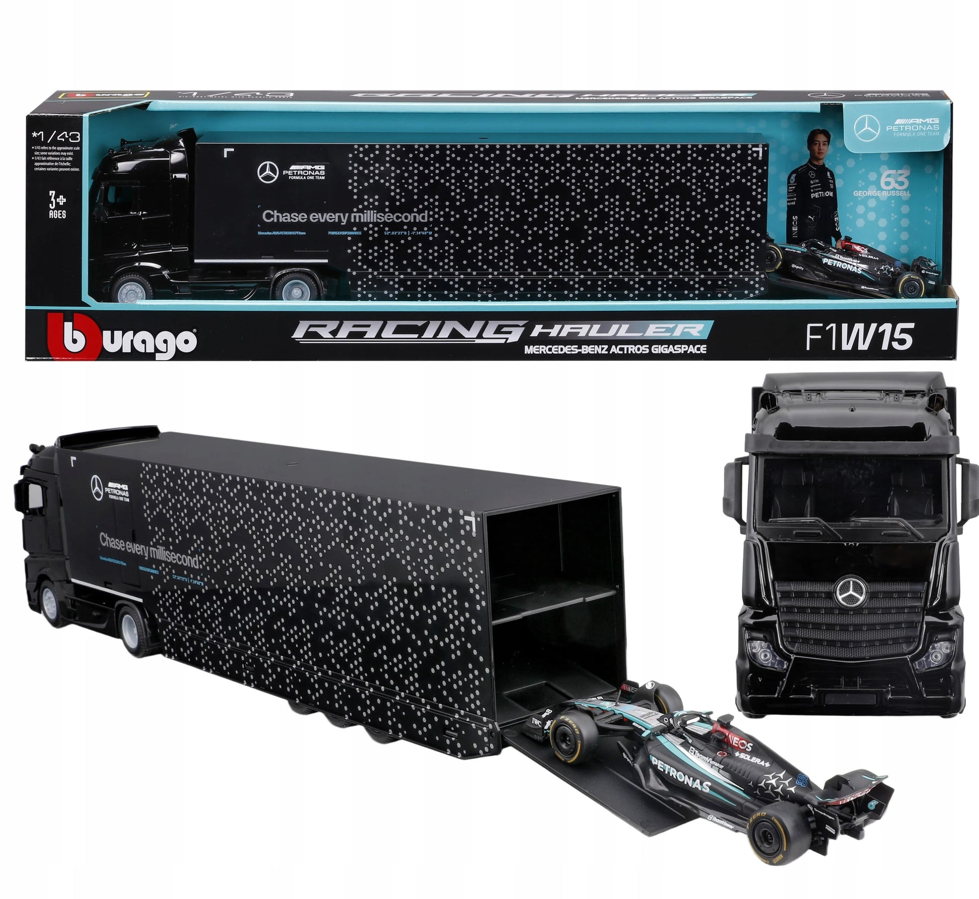 Macheta Transportor Mercedes-Benz Actros Formula 1 Mercedes #63 George Russell , produse la scara 1/43 de Bburago.